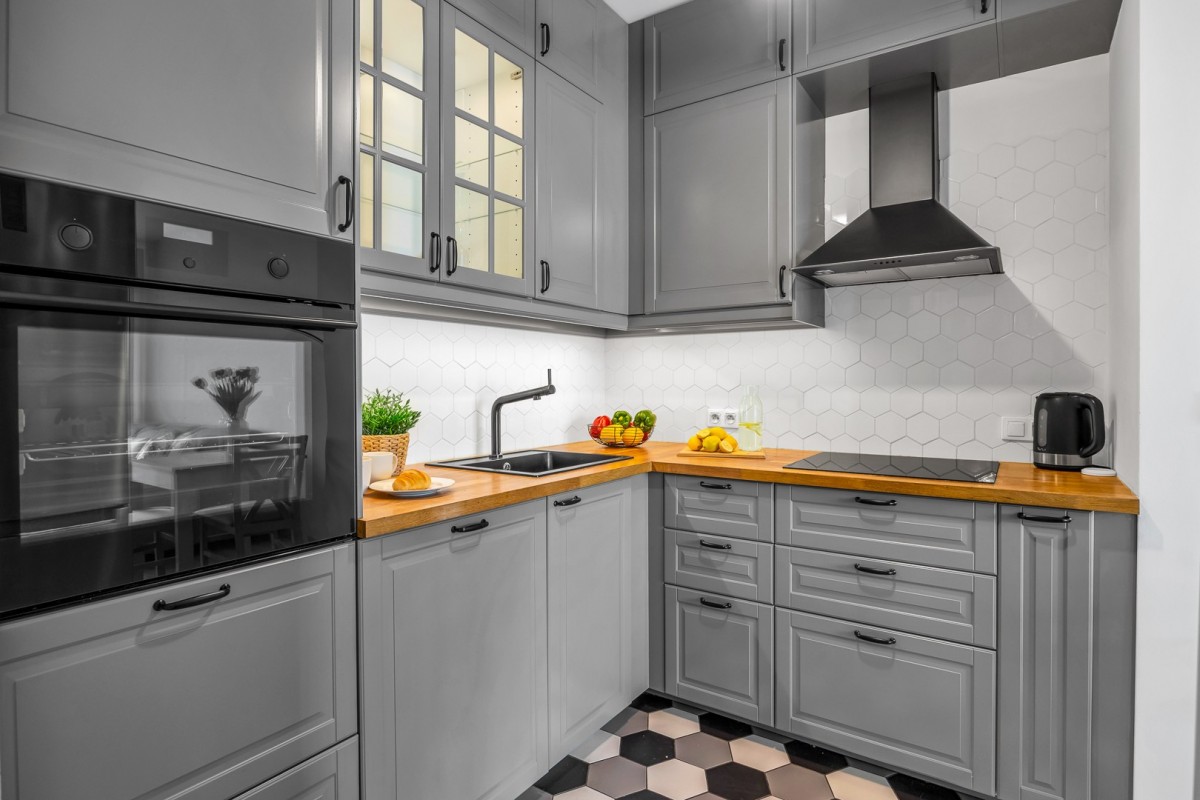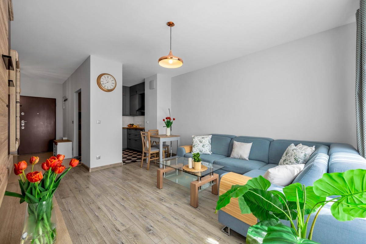 - elegancki aneks kuchenny wyposażony w szafki w zabudowie oraz sprawny sprzęt AGD (piekarnik, zmywarka, lodówka)