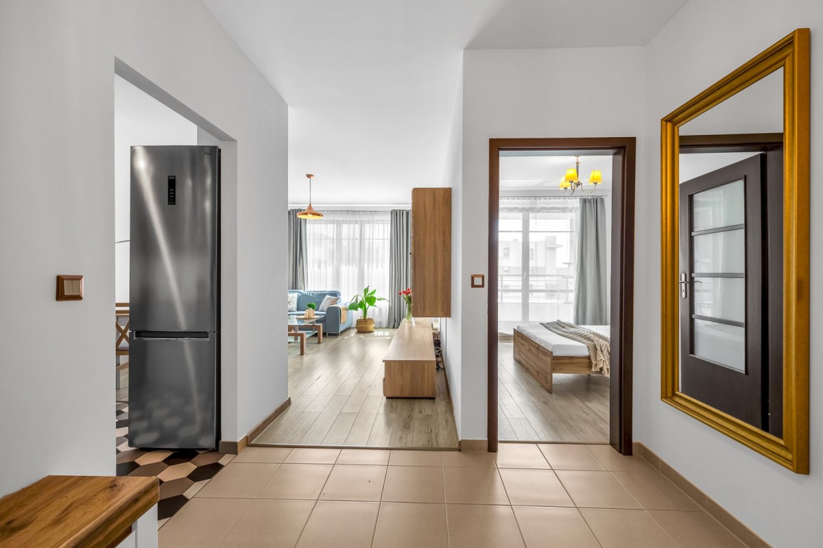- przytulna sypialnia wyposażona w szafę w zabudowie oraz dwuosobowe łóżko
