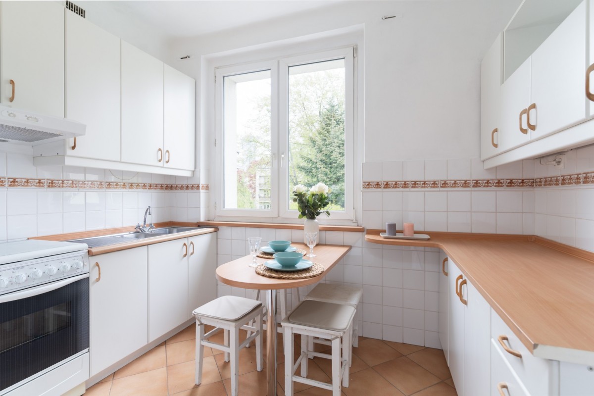 Kuchnia: ok. 9 m² z widokiem na budynek Warsaw Spire oraz inne wieżowce.