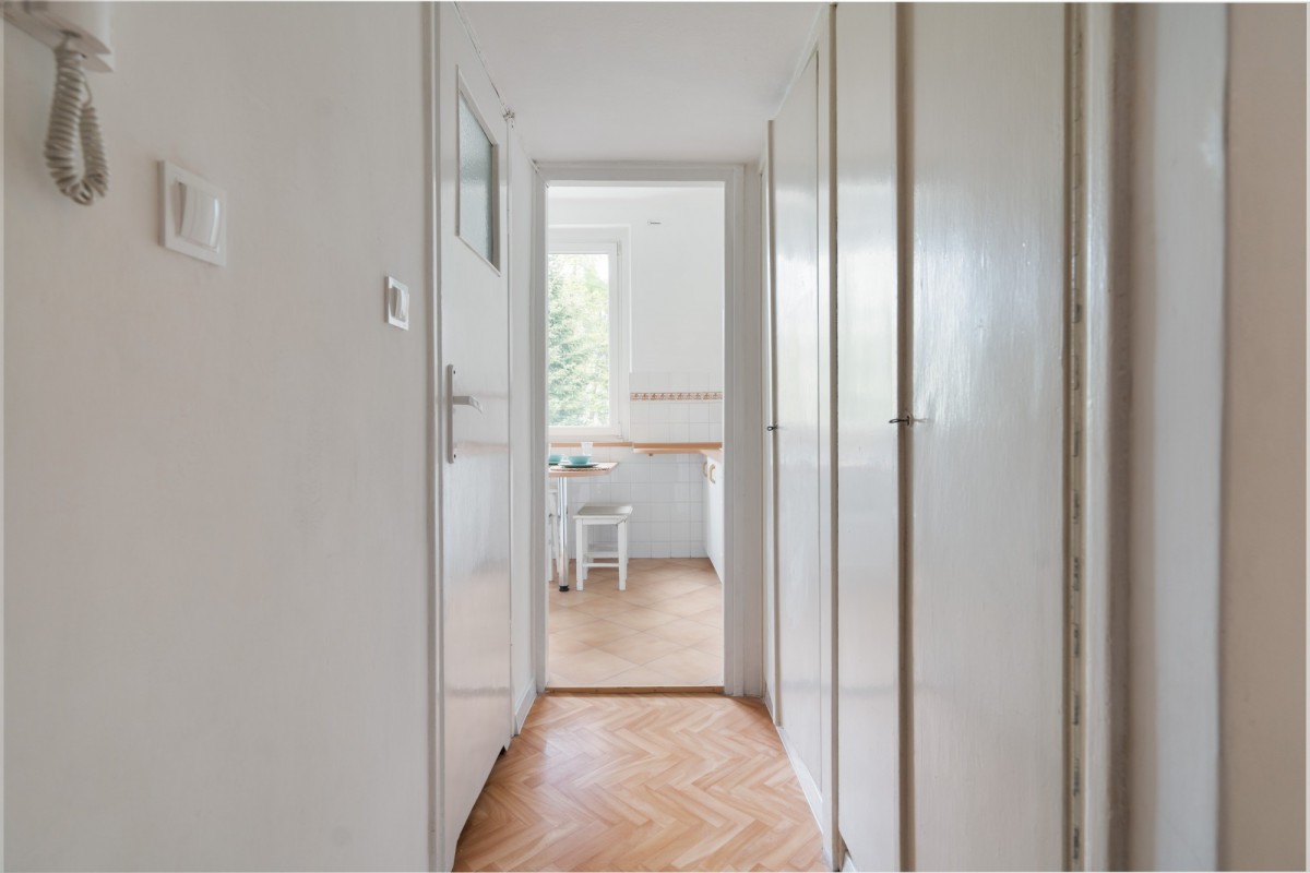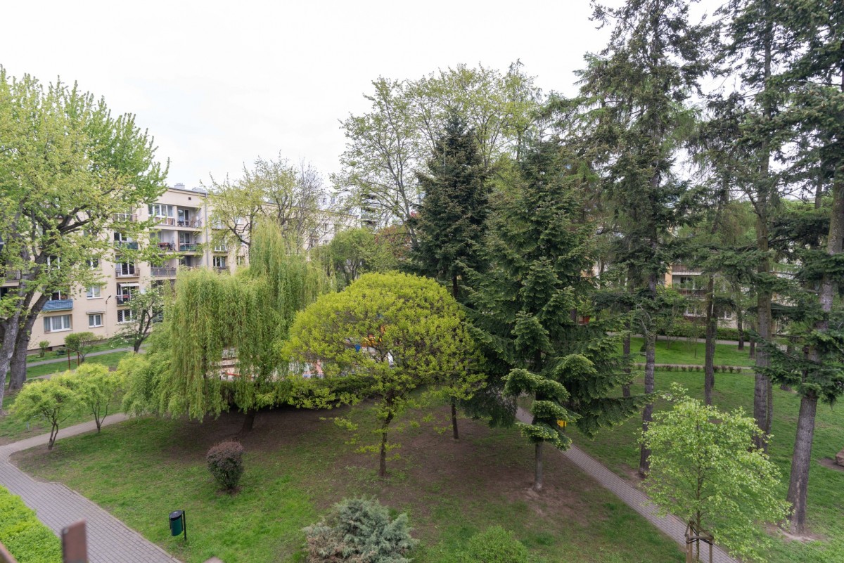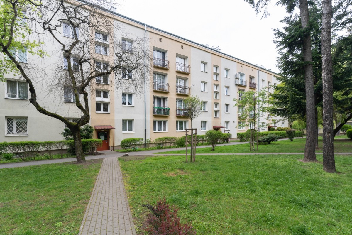Oferowane mieszkanie znajduje się na drugim piętrze bloku wybudowanego w 1958 roku. Mieszkanie ma powierzchnię 57,5 m² i wysokość 280cm. Okna PCV w kuchni i pierwszym pokoju wychodzą na wschód zapewniając wlot porannych promieni słońca oraz minimalne nagrzewanie się pomieszczeń co jest zaletą zwłaszcza podczas przygotowywania posiłków. Panorama z okna łączy spokój z wielkomiejskim duchem za sprawą osiedla, drzew oraz wieżowców wyłaniających się nad osiedlem. W drugim pokoju okna mają orientację zachodnią gwarantując dopływ światła do najpóźniejszych godzin. Taki rozkład zapewnia długie naturalne doświetlenie. Z wyjątkiem kuchni i łazienki w lokalu położony jest drewniany, wycyklinowany parkiet. Ściany zostały świeżo odmalowane na biało. W korytarzu znajduję się bardzo pojemna szafa wnękowa. Pomimo bliskości centrum, osiedle zapewnia spokój poprzez ciszę oraz dostęp do zieleni za sprawą bardzo zadbanego, zadrzewionego podwórka. Blok, jego elewacje, klatki oraz okolica są bardzo zadbane i stale konserwowane dzięki sprawnym działaniom spółdzielni. Mieszkanie posiada duży potencjał do własnej aranżacji oraz do wydzielenia trzeciego pokoju.