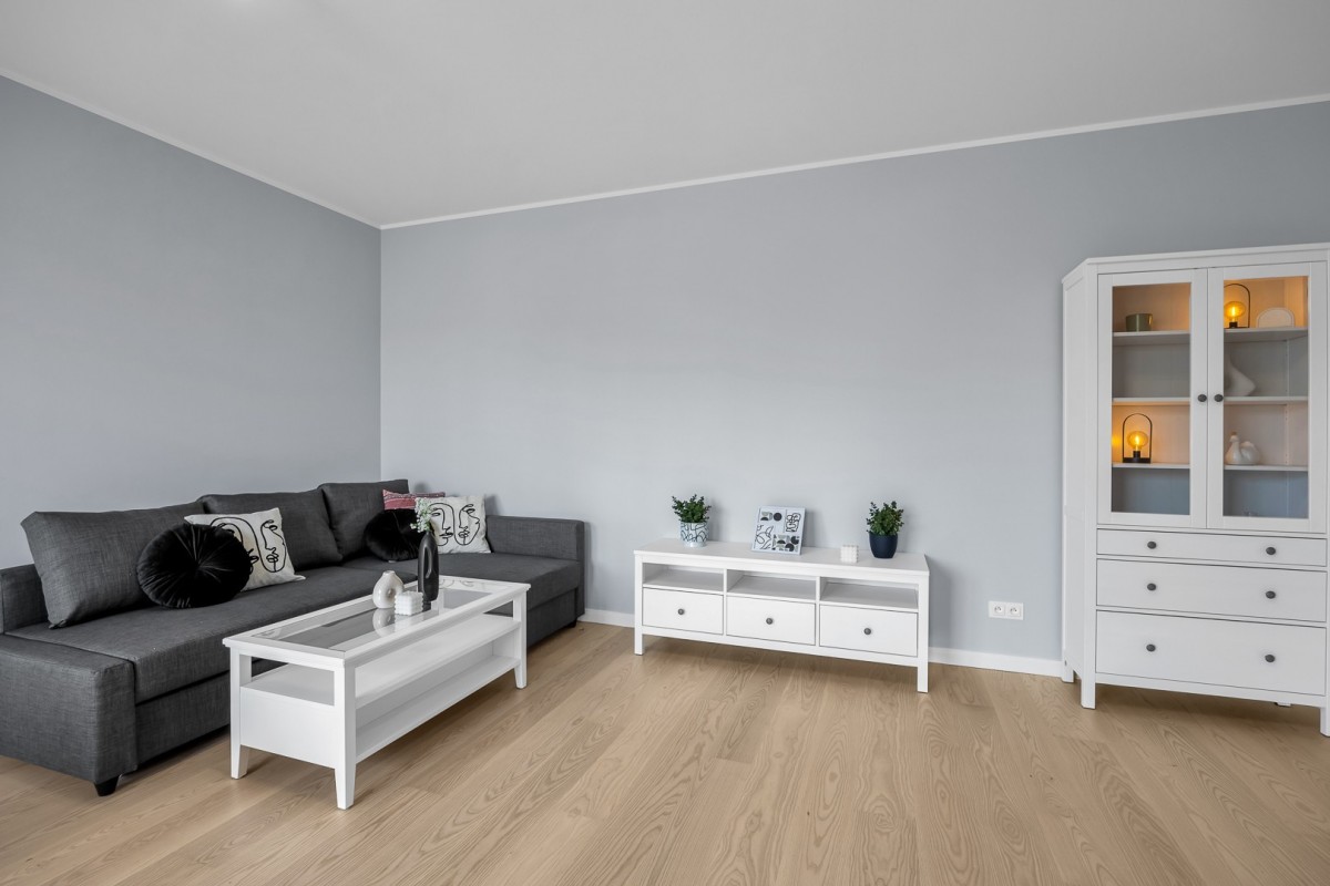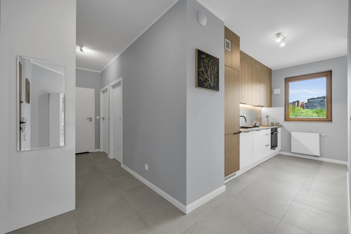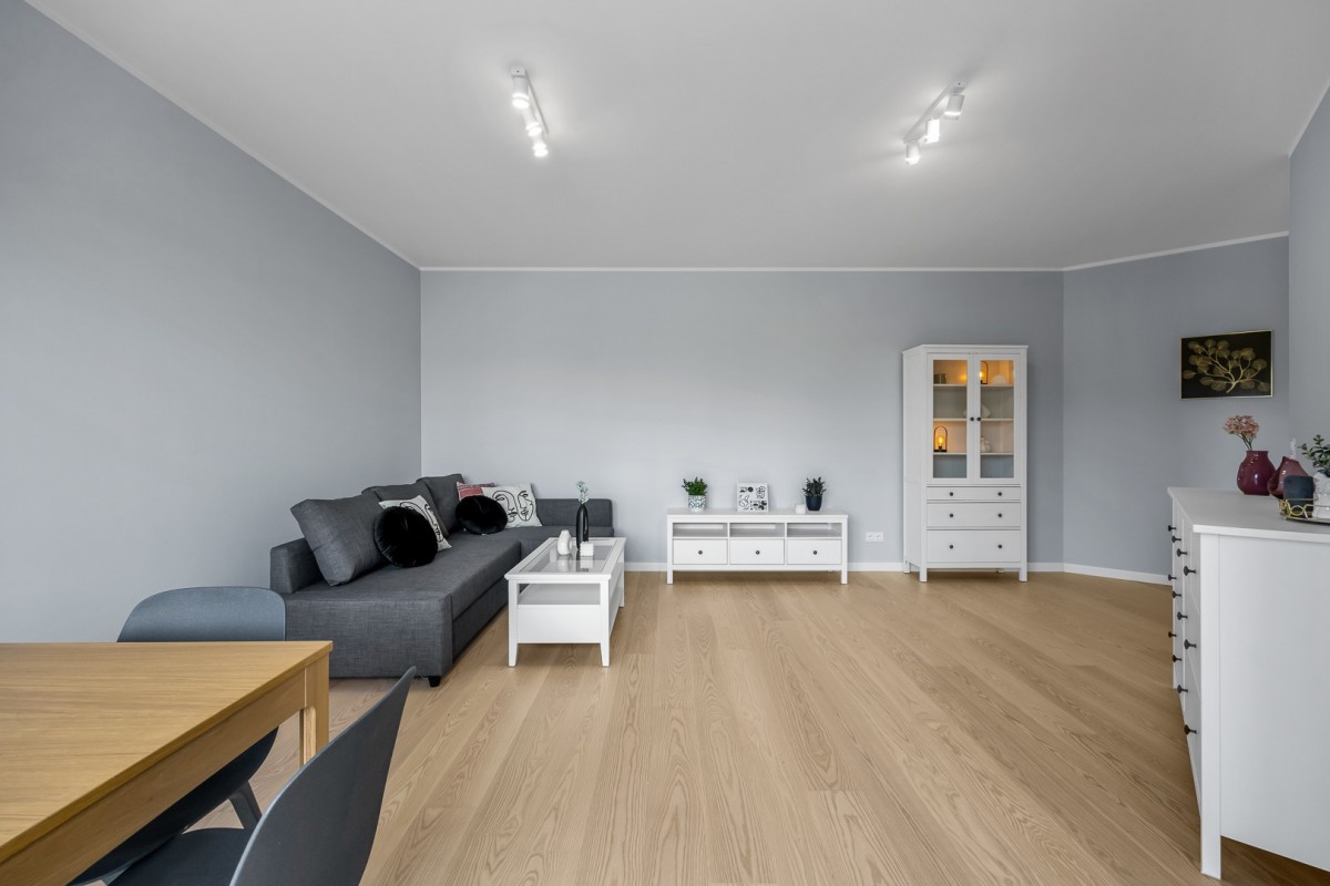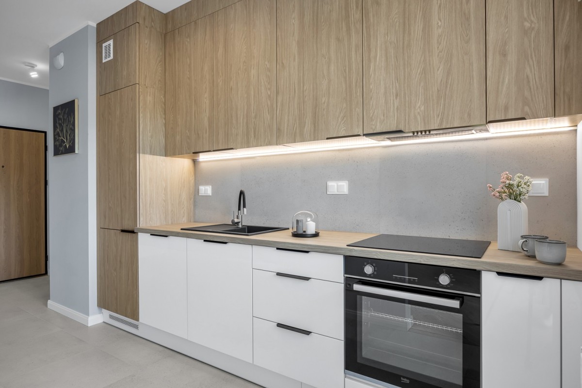 Na powierzchni niespełna 68 mkw, znajdują się znajduje się przestronny salon (25,98 mkw) z częściowo oddzieloną kuchnią (7,73 mkw) i jadalnią. Kuchnia jest w pełni wyposażona w nowe sprzęty i wykonana na wymiar, a kolory drewna i bieli dodają elegancji całości i spójnie łączą się z salonem.