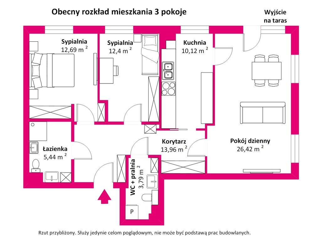 - pokój dzienny (26.42 m2) z wyjściem na mały taras i ogródek,