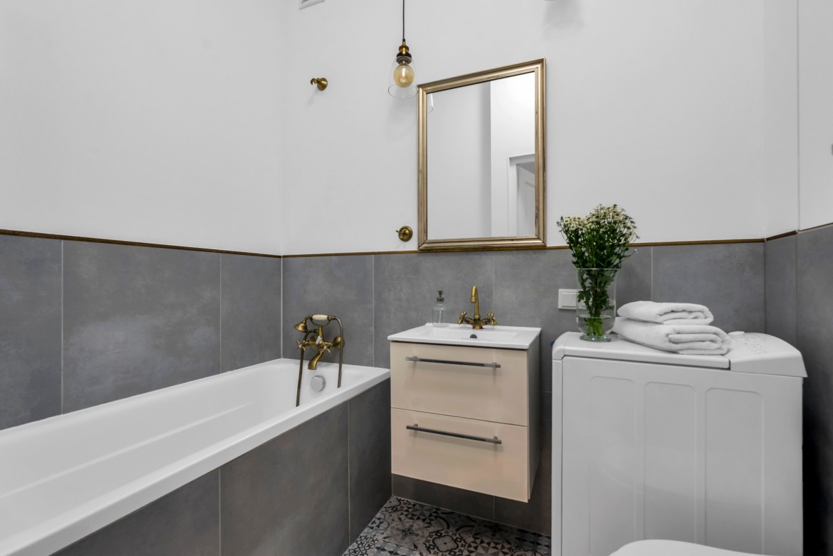 Mieszkanie jest bardzo przytulne i ciepłe, emanuje wyjątkowym klimatem, łącząc nowoczesność z akcentami z epoki socrealizmu. Meble i elementy wykończenia podkreślają atmosferę zabytkowej kamienicy i nadają wnętrzom niepowtarzalnego uroku. Dodatkowo jest świetnie skomunikowane z centrum Warszawy i położone w bliskiej odległości od Łazienek Królewskich.