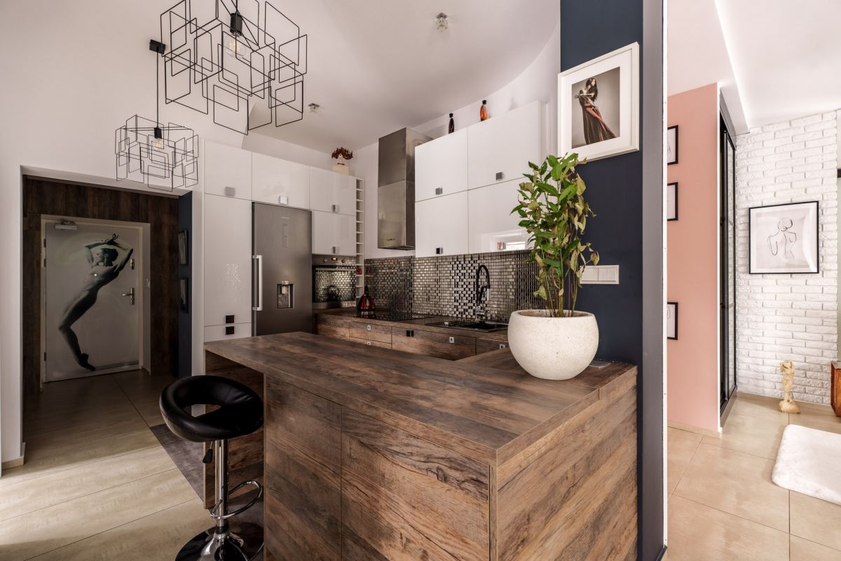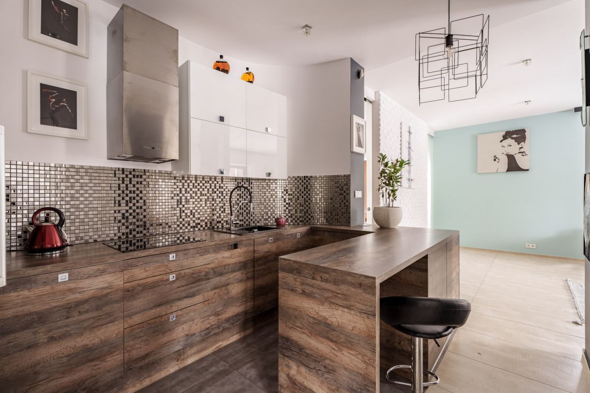 Całe mieszkanie utrzymane jest konsekwentnie w barwach dębowego brązu, szarości i koloru miedzi. Pojedyncze akcenty kolorystyczne dodają mieszkaniu charakteru i podkreślają jego wyjątkowość.