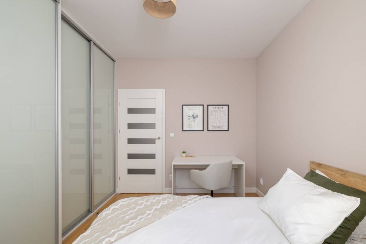 W sypialni znajduje się bardzo duża szafa w zabudowie, 2-osobowe łóżko z materacem oraz biurko z fotelem.