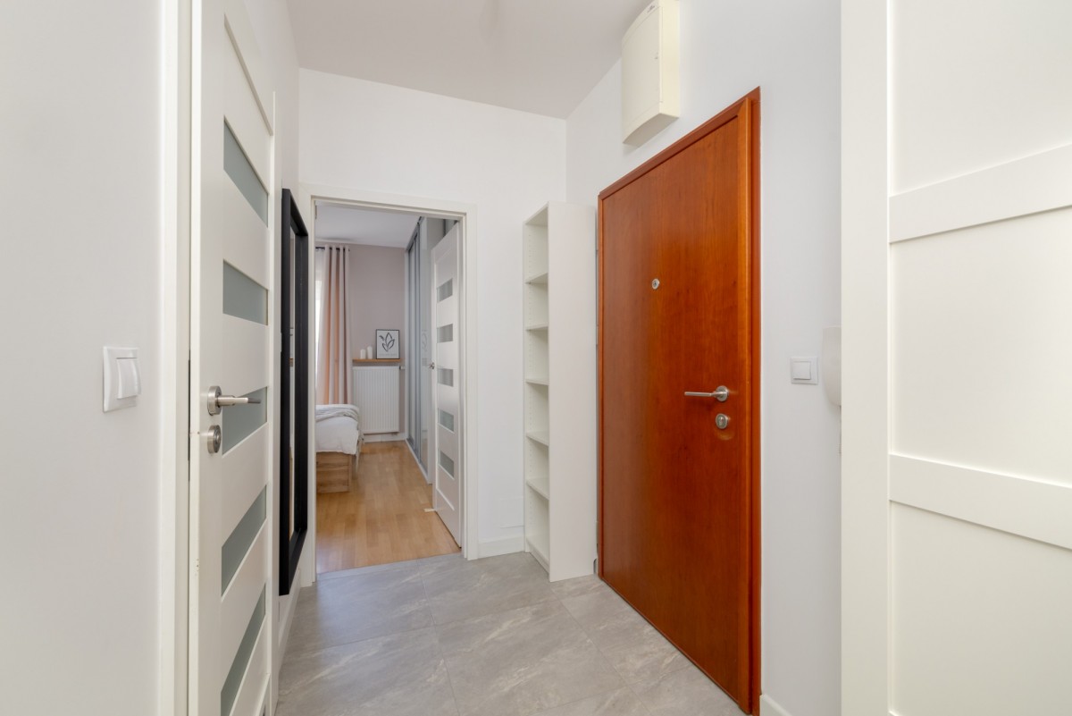 W hallu jest dodatkowa szafa na ubrania wierzchnie oraz regał na torebki lub buty.